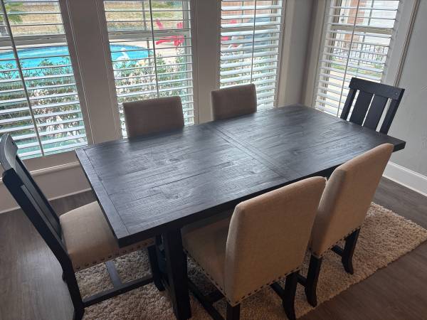 Table has an extension All pieces in great shape and rarely used. Table is 6-4 x 3-4 extension is 1-8. Chairs have no rips, stains etc. Cabinet is matching and 5-6 x 1-8. $1,000 for all Cash only...