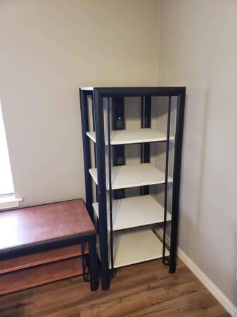 3 piece unit. Black metal frames with wood shelves. Side towers are 25"Wx23"Dx58"T with 5 shelves each, center is 69"Wx23"Dx20T with 3 shelves. Total is about 10ft wide