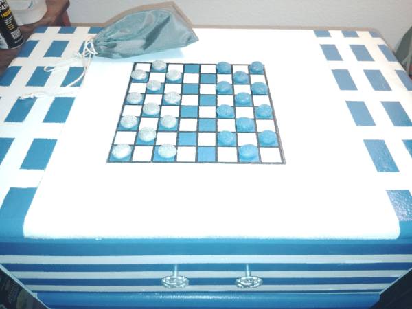 Hand painted blue and white dresser drawer with checker board on top for playing with friends and comes with checker board pieces and tote bag.